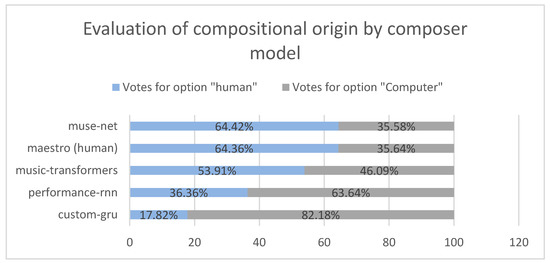It is interesting to observe in Figure 5 that, within the population tested, the MuseNet and Music Transformers models were better evaluated than the musical excerpt of human origin, randomly extracted from the MAESTRO dataset. It is also interesting to note that the models based on an RNN (Performance RNN and Custom GRU) were evaluated as less musical than those of human origin. Another perspective that is worth analyzing started with the evaluation of the compositional origin using the composer model, where we can observe the judgment of the tested population about the origin of the musical excerpt heard.