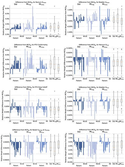See Table 8 for an overview of relative weight calibrations across the validation dataset (as see Supplementary File S1 for an illustration). Statistically significant differences (at the 95% level) were observed between MCOgs and the three alternative methods (PGAPstd, PGAP-MLreg and PGAP-MLclus) for three PGs: rectum Dmean rectum Dmax and PTV dose falloff. For PGAPstd and PGAP-MLreg significant differences were also observed for bowel V36.0Gy and V45.6Gy and the higher priority P1 and P2 goals (PGhigher). Differences were generally small (<3.58%), with PGAP-MLclus closest to MCOgs on average with differences <1.17%. Mean differences from MCOgs were also closest to zero for PGAP-MLclus for six of the eight PG. PGAP-MLreg was the poorest performer overall with deviations <2.49% and 3.57% for PTV conformality and PGhigher, respectively.