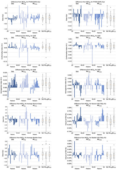 At patient level, deviations in the performance of the three methods was observed, with PGAPstd and PGAP-MLclus highly comparable and PGAP-MLreg the poorest performer. For PGAP-MLreg the most notable deviations from MCOgs were for PTV48 D50%, CIPTV60, CIPTV48, rectum Dmean and bladder Dmean with deviation ranges of [−1.05, 1.22] Gy, [−0.114, 0.0378], [−0.172, 0.0925], [−2.05, 1.93] Gy and [−1.52, 2.03] Gy, respectively. For PGAPstd and PGAP-MLclus, bladder deviations were similar to PGAP-MLreg, but substantially reduced for other metrics with PTV48 D50%, CIPTV60, CIPTV48 and rectum Dmean deviations less than ±0.60 Gy, ±0.02, ±0.06 and ±1.18 Gy, respectively. In general, for PGAP-MLclus and PGAPstd deviations from MCOgs across all patients were considered small and likely not of clinical significance.