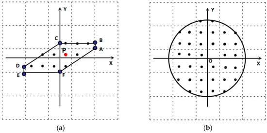 From the aspect of CL20 grain morphology, as shown in Figure 2a, the polygon ABCDEF grain was generated in a local coordinate system, as shown in Figure 3a; then, the polygon grain was discretized into particles. In the local coordinate system, one red particle was chosen. If the point P rotates around the point by a random angle , the new coordinates of the particle can be obtained as follows: