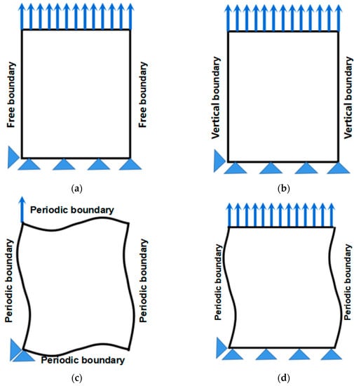 The commonly used boundary conditions: (a) free boundary condition; (b) uniform displacement boundary condition; (c) periodic axisymmetric boundary condition; (d) periodic boundary condition.