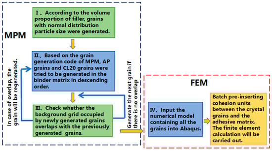 - In this paper, the microstructure model of a GAP/CL20/AP composite solid propellant was established based on the MPM. The developed Fortran codes are suitable for generating grains with arbitrary shapes, such as CL20 and AP grains. The grains are generated in order from largest to smallest. The minimum distance between the generated grains can be controlled by adjusting the size of the background grid. The filling ratio of grains can meet the requirements of the grain proportion in a real propellant. In this paper, it takes about 15 min to generate grains in this numerical model. Therefore, it shows that the numerical model generated by this method is efficient. The generated AP and CL20 grains are imported into the commercial software Abaqus through python scripting codes for numerical calculation.