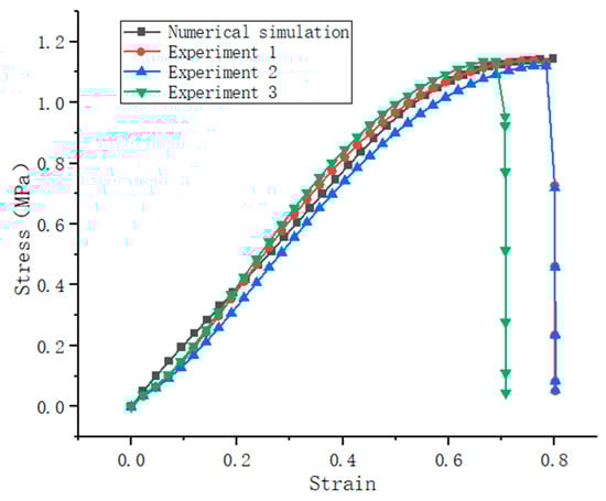 Figure 8 shows the engineering stress–strain curve of the composite propellant at a 100 mm/s tensile rate, wherein the black curve is the curve obtained by numerical simulation, and the curves of the other three colors were obtained from experiments. As shown in Figure 8, when the strain is small (), the propellant is in the linear elastic region, and the stress increases linearly with the increase in strain. When the strain reaches 60%, the interfacial adhesion strength becomes weak, and the stress–strain curve begins to appear nonlinear. When the load continues to increase to a strain of 80%, there is more debonding at the particle interfaces, and the stress hardly increases with the increase in strain. Comparing the simulation curve of the meso-model in Figure 8 with the macro-experimental curve of this propellant, it can be seen that after inversion analysis, the simulation curve is basically consistent with the real experimental curve, the value of the objective interpolation function in Equation (20) is 0.05078%, and the degree of coincidence is very high in the strain range of 20–80%, so it can be considered that the simulation results can reflect a real experiment.