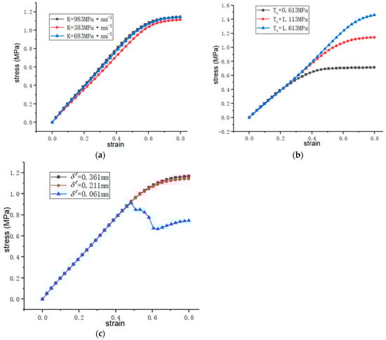 Effect of interface parameters on the stress–strain curve. (a) The stress–strain curves under different parameters ; (b) the stress–strain curves under different parameters ; (c) the stress–strain curves under different parameters .