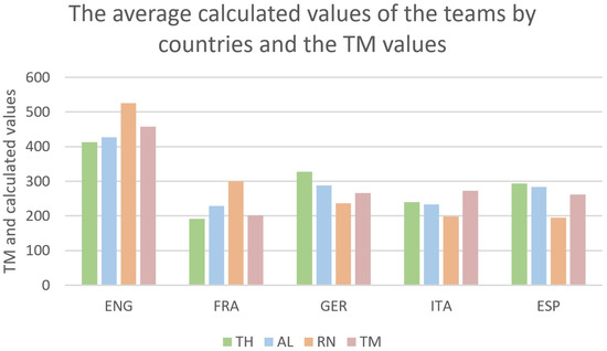 Let us consider the financial values of the teams averaged by country. Figure 4 shows that the Transfermarkt data presented higher values than those computed on the basis of the performance weights produced by the TH and AL methods in the case of ENG and ITA teams. In the case of GER and ESP, the TH and AL methods estimated larger values than the Transfermarkt values. Conversely, the RankNet method overestimated the English and French teams while underestimating the other countries compared to the TM values. This phenomenon aligned with the observation that RN allocated multiple weights for the top teams and only fractional weights for the bottom teams. Overall, the average values computed by the TH and AL methods were closer to the average values of the Transfermarkt data than those computed by the RN method.