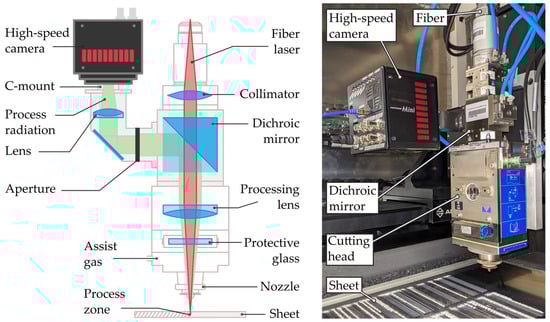 In contrast to laser welding systems or CO2 laser-based cutting systems, for which various sensor concepts have already been reported [15,16], quality monitoring setups for laser fusion cutting using fiber lasers, especially for non-steel materials, are comparatively rarely reported or in industrial use, despite the similar or comparable monitoring and sensor concepts. Systems for quality monitoring based on image sensors have been reported for CO2 laser cutting with external illumination [17] and without external illumination [18,19]. In recordings with external illumination, a band-pass filter or equivalent is used in order to record only the illuminating wavelength for the purpose of imaging the surface and structure of the kerf. In contrast, sensor systems without external illumination record the thermal process radiation from the process zone. Coaxial monitoring approaches for near-infrared laser fusion cutting demonstrate a correlation between the obtained image and the cut quality [20,21]. Whereas for fiber laser flame cutting, coaxial monitoring is more difficult due to the fact that the cutting distortion occurs outside the observation zone, as monitoring is limited by the field of view through the nozzle [22]. To visualize the cutting process inside the kerf, approaches with high-speed cameras positioned off-axial and aligned in the cutting direction are also reported [23,24] also a trim-cut technique through a transparent substrate by a side visual monitoring set up for clear visualization of the melt front inside the kerf [25,26,27], as well as a high-speed x-ray imaging system [9,10] have been demonstrated. These methods provide valuable insights into melt pool dynamics, melt flow velocity, and the geometry of the cutting front and the cutting kerf.