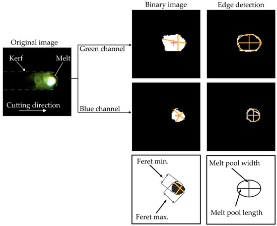 To distinguish complete cuts from incomplete cuts during the cutting process, spectral and geometric information from the melt pool in the kerf was evaluated for the image analysis, as shown in Figure 2. Each recorded image I(u,v,c) was a two-dimensional function with the column in the x-direction and rows in the y-direction for each red, green, and blue color channel. However, since the information from the red color channel appears similar to the information from the green color channel, only the green and blue parts were used for further calculations. As common for digital images, the origin is located at the top-left. Consequently, the x-axis is oriented from left to right, whereas the y-axis is oriented from top to bottom. The information about the individual red, green, and blue color channels was correspondingly provided with a data depth of eight bits, i.e., each color channel was provided with 256 gradients. To reduce the amount of data, only the spatial region of interest was used, and the area outside of the nozzle’s field of view was cut out. In the first step of the algorithm, the image was binarized bw(u,v,c) separately for each channel with the threshold tB = 50. For a lower threshold, a larger area of the melt pool was detected up to the edges of the kerf or the edge of the nozzle’s field of view. At high thresholds, smaller or no amount of melt was detected in the kerf, especially for the blue. This leads to almost identical melt pool sizes for different cutting experiments. It is also worth noting that the threshold value might need to be adjusted depending on the previous image processing steps, process parameters, and camera settings.