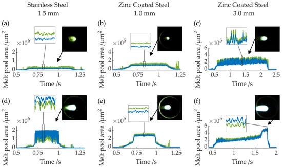 Figure 4 shows the signal of the melt pool area, calculated using the above-described image processing step, over time during the cutting of a sample. To visualize the difference between a complete (upper row of diagrams) and an incomplete cut (lower row of diagrams), exemplifying results for such cuts in stainless steel and zinc-coated steel are presented. A cut is classified as incomplete if the bottom edge of the kerf resolidifies. This is the case when the laser power is insufficient to penetrate the material or when the melt cannot be driven out of the kerf and adhering burr seals the bottom of the kerf. In addition to the diagrams, for each case, exemplarily chosen frames recorded by the high-speed camera are shown. The timeline of each recording starts after the piercing of the laser. During the time frame, the drives start to accelerate, which leads to the laser cut and is indicated by an increase in the green and blue melt pool areas. Towards the end of the cut, the feed rate decelerates, and a decrease in the melt pool area is visible.