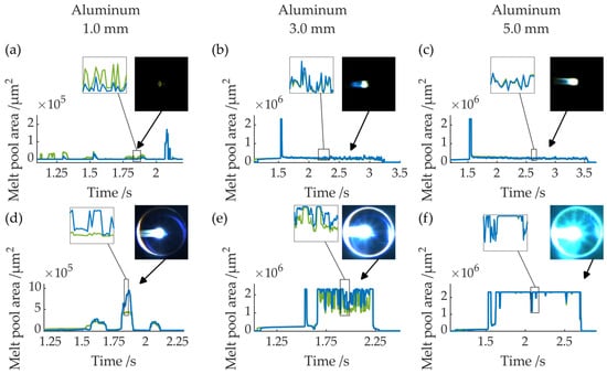 Signals for the green and blue channels of complete cuts (a–c) and incomplete cuts (d–f) and an example image of the corresponding signal highlighted by black arrows for aluminum for sheet thicknesses of 1.0, 3.0, and 5.0 mm.
