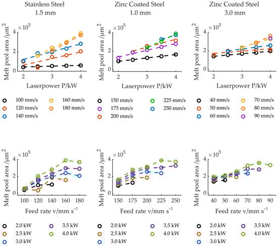 Average size of the melt pool area depends on the laser power and feed rate for 1.5 mm thick stainless steel, 1.0 mm, and 3.0 mm zinc-coated steel.