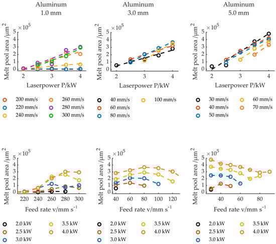 Average size of the melt pool area depends on the laser power and feed rate for 1.0, 3.0, and 5.0 mm thick aluminum.