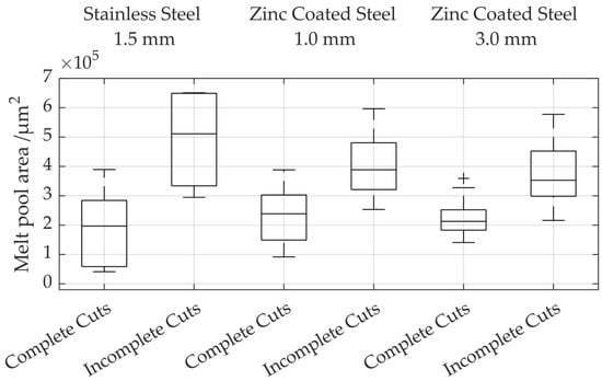 Comparison of the distribution of the melt pool area for complete and incomplete cuts in stainless steel and zinc-coated steel.