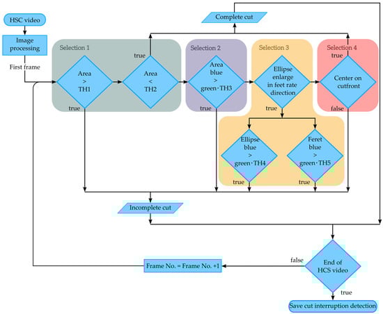 A flowchart specifying the algorithm is shown in Figure 11. As an initial step, the image processing step is performed as described above (cf. Section 2.3) to obtain the area, length, width, ferret diameter, and the center position of the melt pool for the green and blue color channels, respectively. The algorithm for detection of a cutting error was first tested with different thresholds on eight cutting samples, four complete and four incomplete cuts each, for stainless steel, zinc-coated steel, and aluminum, and then applied to all cutting samples. The threshold value for the detection depends on the exposure time, the binarization method of the image processing as well as on the material of the sheet and must also be adjusted for stainless steel, zinc-coated steel, and aluminum.