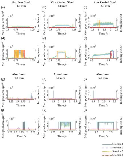 Figure 12 shows the detected signals using the example of complete and incomplete cuts for stainless steel, galvanized steel, and aluminum. It is shown that the selection of one, two, and four occurs in the example of an incomplete cut in 3 mm zinc-coated steel. This indicates that the area of the melt is particularly large, the blue portion exceeds the green portion, and the center of the melt shifts significantly. In the case of an incomplete cut in 1 mm zinc-coated steel, selection three occurs, i.e., the melt pool area is neither too large nor is the blue portion larger than the green portion. However, the melt has an elliptical shape, and the blue melt pool area approaches the width and length of the green melt pool area. In the example of the incomplete cut in stainless steel, a combination of all four selections occurs. For aluminum, as described, only selection one is used to detect incomplete cuts. The example for a complete cut in 3 mm galvanized steel shows an incorrect detection. As can be seen, selection two is triggered occasionally during the cut.