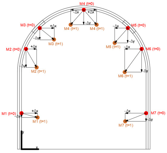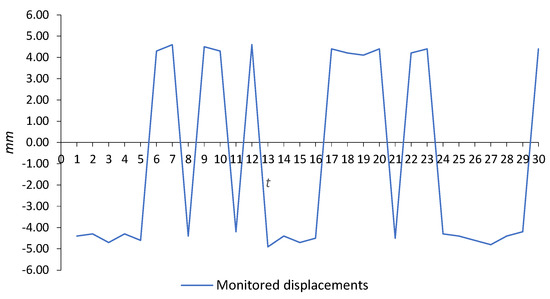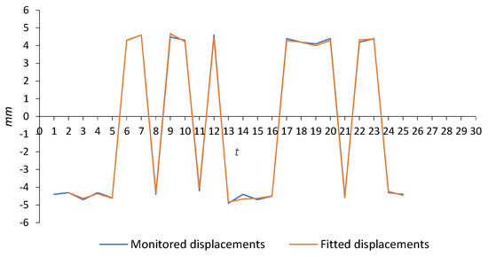 y-axis, respectively. The period of monitoring is thirty days. This set of displacements is divided into two subsets, fitting and forecasting subsets. The period ranging from the first to the twenty-fifth day (25 values) was used as the fitting subset, and within this interval, we checked the model accuracy by comparing the fitted and monitored values of displacements. The second subset ranging from twenty-six to thirty days (5 values) was used as the validity subset, and in this period, we made a comparison between forecasted and monitored displacements. The positions of seven markers are defined around the internal rim of the steel arch support; see