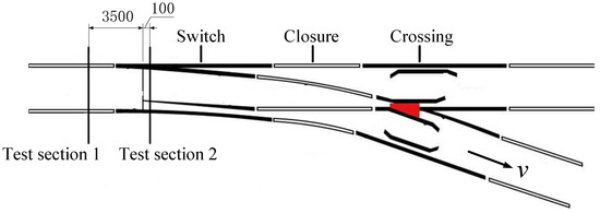 In the field test of low-floor trains passing no. 6 switch, there were two test sections at which the wheel–rail contact forces were measured, as shown in Figure 1. Test Section 1 was set at 3500 mm in front of the tip of the switch rail and test Section 2 was set at 100 mm behind the tip of the switch rail.