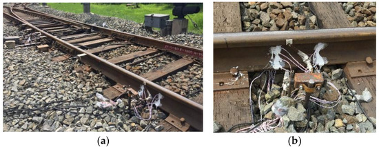 Field test of low-floor trains passing n. 6 turnout: (a) The general test configuration; (b) the strain gauges applied on the rail waist.