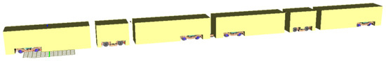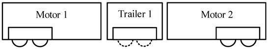 In the test, a 70% low-floor train was adopted. The vehicle–track coupling dynamics model was constructed with the help of multi-body dynamics software, UM9.1.1.0. The rail profiles were measured in the test and imported into UM. A basic module of the train consists of two motor vehicles and one trailer vehicle (Figure 3). A motor vehicle in Figure 4a includes one carbody, one bogie, four axle boxes, two integrated wheelsets, and suspension devices. A trailer vehicle in Figure 4b has the same parts as motor vehicle except for the two independently rotating wheelsets. In Figure 4, the red, green and blue lines show longitudinal, horizontal and vertical orientations, respectively. The low-floor vehicle used in the field test contains two modules (i.e., six vehicles in total), and a corresponding model was established in UM, as shown in Figure 5. There are a total of 24 wheels of the two modules, of which the treads were measured by the WS2016-3W-LFT wheel tread measuring instrument. The motor and trailing bogies have the same wheel profiles. The main parameters of the dynamic model are listed in Table 1.