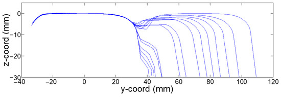 To investigate the dynamic performance of low-floor trains passing the turnout switch in facing direction based on the vehicle–track coupled dynamics theory [20], the left (outer) rails in the switch of the no. 6 turnout (stock rail and blade rail) were treated as variable profile rails in the MBS dynamic software, while the right (inner) rail and the closure rails were treated as a constant profile rail (50 kg/m rail). For the stock rail and blade rail, 15 profiles were measured, as shown in Figure 6. The FASTSIM method was employed to solve the wheel–rail contact relationship.