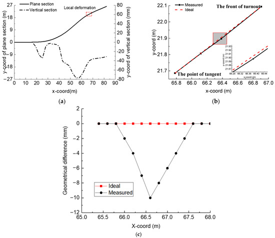 The plane and vertical sections of the line were mapped by a total station, as shown in Figure 7a. It should be noticed that there is a reverse curve in the line before the turnout, of which the radius is 50 m. After the reverse curve, there is a 1.2 m long tangent, which connects the reverse and the turnout. In addition, by amplifying the measured data at the tangent, it can be observed that it is not an ideal straight line, but a fold line bent towards the inside of the line (Figure 7b), in which the maximum internal shift distance is 10 mm and geometrical difference between the measured and ideal irregularity along the x-coordinate were shown in Figure 7c. Considering that the length of the tangent is rather short and there is alignment irregularity in the tangent, the dynamic performance of the train will inevitably deteriorate when passing through the tangent in such an abnormal state, which will accumulate until the train enters the turnout, thus leading to detrimental influence on the dynamic performance of the train in the turnout switch.