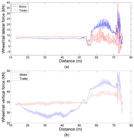 Using the established model, the dynamic performances of the low-floor train passing through the no. 6 turnout in facing direction were calculated. The speed took 5 km·h−1 and the wheel–rail friction coefficient was 0.25. Figure 8 shows the calculated wheel–rail lateral force and vertical force of the outer leading wheel of motor 1 and trailer 1.