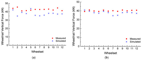 Figure 9 and Figure 10 show the measured and simulated root mean square values of the vertical and lateral forces of the 12 outer wheels at Section 1 and Section 2, respectively. It can be seen that the simulated vertical forces are smaller than the measured value in general, and the fit between the measured vertical forces and the simulated ones at Section 2 (in the switch) is better than that at Section 1 (before the switch), especially in the first six wheels. The maximum values of wheel–rail forces on Section 1 and Section 2 are taken from Figure 9 and Figure 10, and the relative error is obtained (as shown in Table 2). The simulation of lateral forces and the measured results are also in good agreement in terms of the trend and values. Thus, the calculation results of the established simulation model are of high reliability.