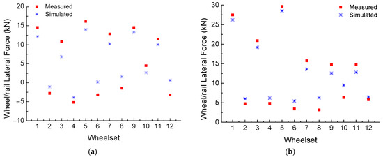 The root mean square value comparison of the wheel–rail lateral force of the outer wheel: (a) lateral force values at Section 1; (b) lateral force values at Section 2.
