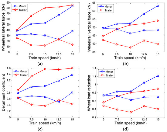 As seen in Figure 11, in general, since there are alignment irregularities on the tangent before the switch, the wheel–rail relationship just begins to deteriorate at this part, and the magnitudes of the wheel–rail contact forces on the tangent are higher than those of the switch zone. Alongside that, the variation of train speed has a significant influence on the dynamic performance of the train passing through the tangent and switch. The existence of alignment irregularities in the direction leads to a higher possibility of derailment under a respectively small train speed. In detail, the wheel–rail lateral forces of the outer leading wheels of the motor and the trailer increase with the increase in the vehicle speed in the tangent before the switch, but the increase rate is different, as the lateral force of the trailer wheel (independently rotating wheelset) grows faster under the respectively low train speed, and becomes gentle with higher train speeds, while the lateral force of the motor wheel (integrated wheelset) increases gently under low train speeds and faster under high train speeds. After entering the switch, the lateral forces of the motor and trailer wheel are smaller than those in the tangent, and the lateral force of the motor wheel slowly decreases before the speed of 12.5 km·h−1, while the lateral force of the trailer wheel decreases first and then increases. After the speed of 12.5 km·h−1, the lateral force of the motor wheel starts to increase while that of the trailer wheel decreases. The derailment coefficient sees the same trend as the wheel–rail lateral force. As for the wheel–rail vertical force, the vertical force of the trailer wheel is smaller than that of the motor wheel, whether in the tangent or in the switch zone, which is mainly because the axle load of the trailer is respectively light, at about one third of motor axle load. The variation trends of the vertical force of the motor and the trailer in the tangent and the switch zone are the same as the trends of the lateral force in the corresponding position, but the turning point of the vertical force variation of the motor is earlier at the speed of 10 km·h−1. The variation trend of the wheel load reduction is consistent with that of the vertical force. When there is bad alignment irregularity in the tangent before the turnout, the wheel–rail dynamic performance in the tangent is worse than that in the switch; the dynamic indexes of the integrated wheelset and the independently rotating wheelset increase with the train speed increasing, but at different increase rates. In the switch, the dynamic indexes of the integrated wheelset decrease first and then increase with the increase in speed, while those of the independently rotating wheelset first decrease, then increase and eventually decrease.