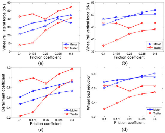 The alignment irregularities in the tangent before the switch cause abnormal wheel–rail, aggravating the wheel–rail dynamic effect, leading to the severe wear of rail surface, which results in a large variation in the wheel–rail friction coefficient. Subsequently, the increase in friction will also influence the wheel–rail contact state, affecting the safety of the train passing switch. The magnitudes of simulated results under the wheel–rail friction coefficient 0.10, 0.175, 0.25 (basic friction), 0.325 and 0.40 are shown in Figure 12. It should be noted that in this paper, the wheel–rail friction coefficient refers to the friction coefficient of both the rail top and gauge angle of the stock rail and the blade rail.