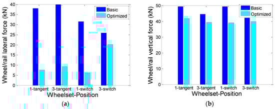 As analyzed above, in the field test and simulation calculation, the abnormal track alignment in the tangent between the reverse curve and the turnout causes severe wheel–rail impact before entering the switch. The adjustment amount of the alignment irregularities ahead of the turnout is eliminated, and the simulation results of the optimized alignment are compared with the results under basic conditions, presented in Figure 13.