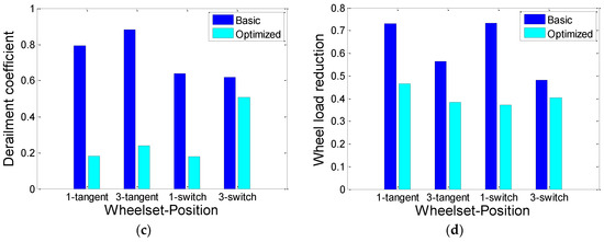 - Eliminating alignment irregularities before the switch can effectively improve the dynamic performance of the integrated wheelset in the switch, and the lateral forces of the outer wheels of these two vehicles are reduced by about 80%, the derailment coefficients are reduced by about 70%, the vertical force reduced by about 10–20% and the wheel load is reduced by approximately 30%. Due to keeping in flange contact with the outer rail entering the switch, the independent wheelset has a rather limited promotion in dynamic performance when passing the switch.