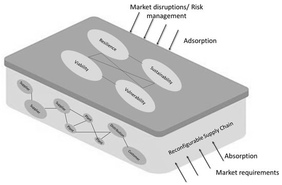 In an unstable and uncertain market context, the vulnerability of supply chains should be considered as a criterion for selecting the reconfigurable supply chain configuration to ensure a viable and resilient supply chain, i.e., less exposed to risks and market disruptions. This concept can be explained with the notion of the sponge effect (characterized by the phenomenon of absorption and adsorption) of the supply chain, i.e., the ability of the supply chain to absorb market needs and requirements while remaining unaffected by market risks and disruptions as shown in Figure 6. The absorption of market needs is achieved by ensuring a reconfigurable supply chain, which is defined as the ability to meet customer needs by changing the structure and functions of the supply chain. Adsorption refers to the ability of the supply chain to cope with market disruptions by ensuring resilience/viability to reduce its vulnerability. In future work, it is recommended to answer the following question: