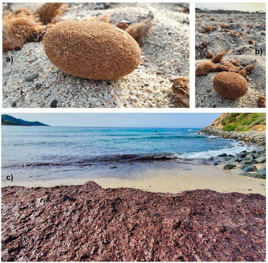 Examples of Posidonia Balls (a,b) and “banquettes” on the beach (c).