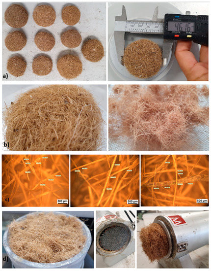 Aegagropiles of different sizes were collected on the beaches of southern Sardinia. The collected material was found in dry sand, free from humidity. Once harvested, it was left out in the sun for several days to eliminate any residual humidity. Each Aegagropile appears as a very dense interweaving of fibers with a well-defined geometric shape similar to an ellipsoid. The samples have a flattened shape in one direction, while in the other two the semi-axes have similar dimensions to each other (Figure 2a). The collected Aegagropiles vary in density, which ranges from 85 to 180 kg/m3.