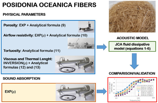 Schematic diagram of the procedure for the characterization of Posidonia fibers and acoustic modelling.