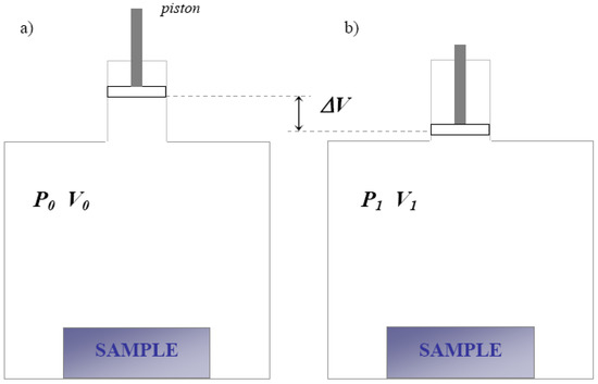 Schematic diagrams of the porosity measurement system based on the air volume compression method: (a) before the compression, (b) after the compression of know volume ΔV [26].
