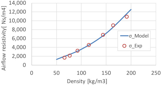 Figure 6 shows the experimental values of airflow resistivity with respect to the apparent density of the fibers; to extend the experimental data to all bulk densities, an interpolation curve was calculated, using the relationship proposed in [31]:
