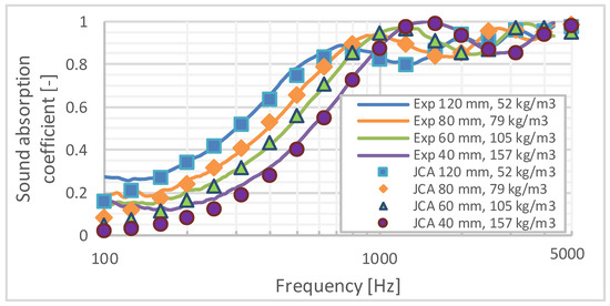 Comparison between the experimental measurements (Exp) and analytical model (JCA) for four different combinations of thickness and density (constant sample weight).