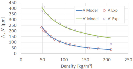 - Viscous and thermal characteristic length Λ and Λ’ using the inversion technique [32] starting from the experimental acoustic measurements described in Section 2.2.3 and assuming the validity of the JCA equivalent dissipative fluid model. For each measurement of acoustic absorption relating to a specific density and thickness, the values of porosity, tortuosity, and airflow resistivity were fixed in the relationships (9), (10), and (11). The values of Λ and Λ’ were calculated through a procedure of inversion, minimizing the difference between the experimental absorption curve and the one calculated with the JCA model. The values of the viscous and thermal characteristic lengths obtained are shown in Figure 8 as a function of the apparent density; subsequently, to extend the results to any density through an analytical formulation, the following exponential interpolation equations were obtained: