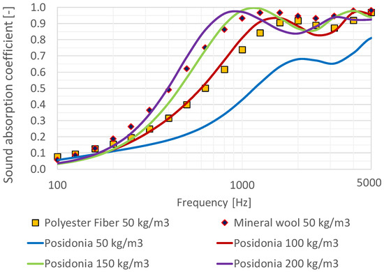 From Figure 7, it is evident that the Posidonia fibers have promising sound-absorbing properties in a wide range of densities.