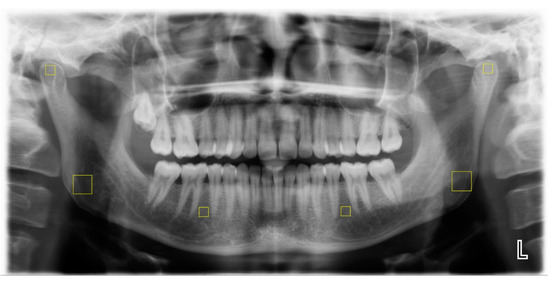 - Shrout, M.K.; Farley, B.A.; Patt, S.M.; Potter, B.J.; Hildebolt, C.F.; Pilgram, T.K.; Yokoyama-Crothers, N.; Dotson, M.; Hauser, J.; Cohen, S.; et al. The effect of region of interest variations on morphologic operations data and gray-level values extracted from digitized dental radiographs. Oral Surg. Oral Med. Oral Pathol. Oral Radiol. Endod. 1999, 88, 636–639. [Google Scholar] [CrossRef]