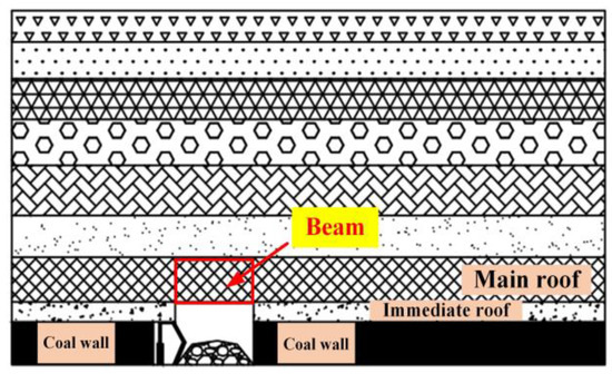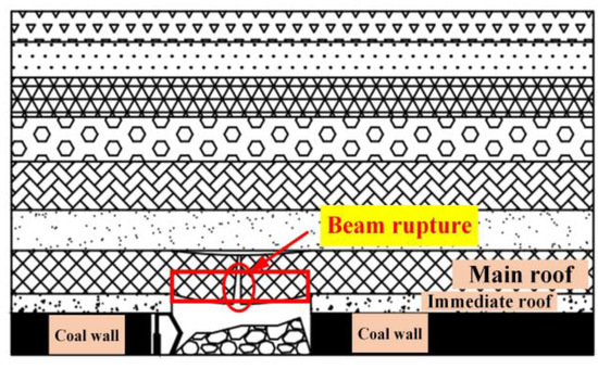 The movement of rock strata before the initial mining roof rock mass does not produce cracks is small. With the mining of the working face, the roof of the direct roof and the basic roof strata begins to fall when the goaf reaches a certain distance. However, due to the filling effect of the residual coal in the direct roof and the mining area, the basic roof strata can often form a stable beam plate structure. The so-called beam plate refers to a conversion process from beam to plate structure, not a single structure. Through the research on the characteristics of the roof caving by many scholars at home and abroad, it is found that with the increase of the exposed area of the roof, the failure characteristics are often O-X type, that is, the roof first cracks at the bottom boundary near the coal wall and then cracks appear on the plate surface [31]. The upper rock layer of the main roof transfers the self-weight to the main roof, and the load gathers at the roof boundary and the coal wall and transfers to the deep rock mass. At this time, the load transfer can be regarded as a process of transfer through the beam structure. With the increase of the exposed area of the roof, the beam structure breaks after reaching its ultimate load capacity. After the beam structure of the roof boundary is unstable and broken, the load is difficult to transfer to the deep rock mass through the roof boundary and begins to transfer to the roof center, as shown in Figure 1.