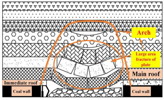 The beam structure often exists before the first weighting of the main roof. After the first weighting, the beam structure is destroyed, and the roof instability begins to bend, separate, and collapse. The collapse area increases with the increase of the hanging area of the roof advancing the working face, that is, the periodic weighting stage of the main roof. At this time, the way of load transfer and transfer in overlying strata has changed. Because the beam is broken and cannot be used as the carrier of load transfer to deep rock mass, the load begins to gather in the center of the roof and then spreads outward from the center. The transformation from beam structure to plate structure can be approximately regarded as the process from ‘line’ to ‘surface’. After the initial weighting, the stress concentration phenomenon begins to appear in the center of the plate and intensifies with the further increase of the exposed area until it breaks and collapses beyond the ultimate load capacity of the plate, and its fracture characteristics are often X-O type. Due to the weak load capacity of the overlying strata, the overlying strata bend and sink as a whole with the sinking and breaking of the basic roof. At this time, the transfer and transfer of load are carried out in the plate structure until the large-scale instability and breaking of the plate structure occurs [32]. Collapse and accumulation form a structural arch supported by the coal body at the open-off cut and the coal wall in front of the stope, as shown in Figure 2 and Figure 3.