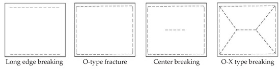 It can be seen from the above that the stress value of the fixed long side at the bottom of the roof is large so that the ‘beam’ at the bottom of the roof is more likely to reach its ultimate strength and fracture. Therefore, the rectangular roof will first break at the long side of the fixed support of the thin plate. After the ‘beam’ is broken, the short side of the fixed support is broken. After all the fixed support edges are broken, the cracks gradually develop, and the broken boundary of the simply supported edge is connected to form an ‘O’-shaped broken ring. After that, cracks are generated in the center of the plate surface and extended to the surrounding areas to develop an ‘X’-shaped fracture, that is an ‘O-X’-shaped fracture.