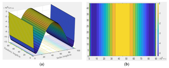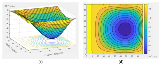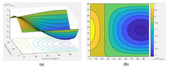 Plate length a = 100 m, plate width 2a = 50 m, plate thickness s = 4 m, Poisson’s ratio μ = 0.25, elastic modulus E = 30.3 GPa. By calculating the bending moment values of the beam–slab structure surface in x and y directions under this boundary condition, the contour map of the internal force distribution of the three-dimensional surface is made by using Matlab numerical fitting software, as shown in Figure 9: