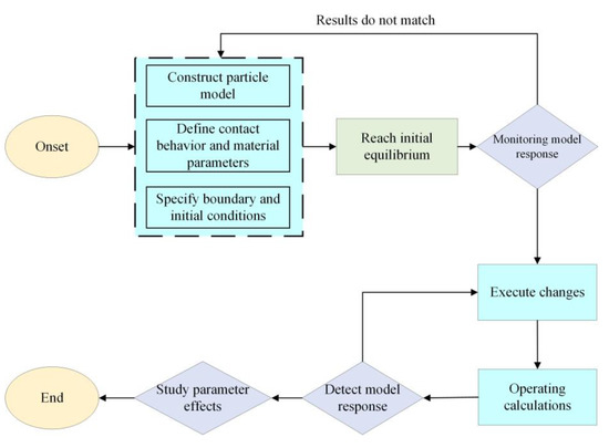 The PFC particle flow code is a discrete element method. Its basic unit is granular particles, which generate displacement and force through the extrusion contact between particles and the movement of particles. Particle flow was first mainly used in the analysis of granular materials; with the deepening of people’s research, granular materials can not meet people’s research on solid materials, where the introduction of bonding properties between the particles (including parallel bonding and contact bonding) to achieve similar mechanical properties of solid materials. At the same time, particles can generate a variety of shapes to reach the basic unit of rock mass, similar to the actual engineering geology through bonding. Because the characteristics of particles can be bonded and formed at will and can move freely without being limited by displacement, they have obvious advantages in simulating large deformation problems, especially failure and fracture problems. At the same time, they can simulate and analyze the progressive failure and fracture process of materials, which is very suitable for analyzing the mechanical characteristics of rock failure, the PFC calculation flow is shown in Figure 14.