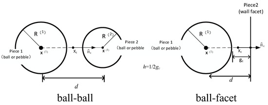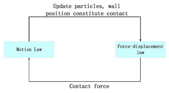 The PFC particle flow numerical method is based on Newton’s second law and force-displacement law to calculate the particles of the model. The motion of the particles follows Newton’s second law, and the interaction between the particles obeys the force-displacement law. Newton’s second law microscopically reflects the movement of granular matter, and the macroscopic performance is the displacement of the object. The law of force and displacement reflects the change of the internal contact force chain of granular matter, and the macroscopic performance is the change of the stress of the object. Both the force-displacement law and Newton’s second law act simultaneously during the operation until the system reaches equilibrium or the set calculation time step is stopped, as shown in Figure 15.