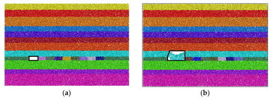 When the working face is advanced to 50 m, the initial pressure load capacity of the basic roof gradually decreases, and a large number of cracks appear at the roof boundary; that is, the ‘beam’ breaks, and the basic roof has a separation phenomenon, with the obvious sinking phenomenon. After the ‘beam’ is broken, the load on the center of the plate surface increases, and the center of the plate gradually produces unpenetrated small cracks. The plate does not break and does not collapse. At this time, the height of the collapse zone is 5.25 m. When the working face advances to 60 m, the main roof appears periodic weighting, and the cracks inside the plate gradually increase. The development of cracks leads to the fracture of the rock strata. After the main roof is broken by periodic weighting, many small cracks begin to appear in the rock strata with weak load capacity above it, and the separation phenomenon occurs. At this time, the caving height is 7.24 m.