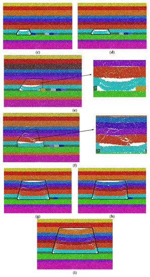 In summary, when the advancing distance of the working face is small (advancing 40 m), the immediate roof directly fills the goaf due to its low strength. As the working face continues to advance, the exposed span of the overlying main roof strata continues to increase after the direct roof collapses, forming a fixed beam structure at both ends of the coal wall at the open-off cut. When the fixed beam reaches the limit span, the fixed beam is destroyed, and the first pressure occurs at the working face (as shown in Figure 18e). As the working face continues to advance, a new load structure, namely the plate structure, is formed after the main roof beam breaks (as shown in Figure 18f). With the increase of the exposed area of the plate, the plate is prone to break and form periodic weighting. At the same time, the repeated breaking of the plate is the periodic weighting process of the working face. Most of the collapsed rock masses are arranged regularly, and the rock masses are stacked at the coal wall position; one end of the rock mass is at the coal wall, and the other end is on the coal gangue in the goaf. Moreover, in the process of continuous advancement of the work, the roof spans develop upward and forward, the height of the span zone increases, the deformation and failure of the rock mass increases, and the rock mass of the goaf span is slowly compacted. At the same time, the fracture position of the rock stratum at the coal wall is shown in the figure. The rock stratum is close to the direction of the goaf from the position of the coal wall, and the rock stratum presents a step-like fracture. The whole structure gradually evolves from the plate structure to the arch structure (as shown in Figure 18i).