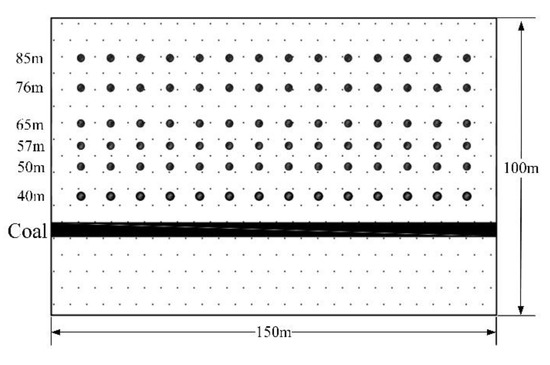 In order to quantitatively analyze the subsidence law of roof strata, the subsidence data of rock strata are recorded. At the height of 40 m, 50 m, 57 m, 65 m, 76 m, and 85 m, respectively, set up six layers of monitoring points; each layer set up 14 measuring balls, namely from 0 to 150 m, every 10 m to establish a measuring ball, in order to analyze the movement of different heights of rock subsidence law. The Figure 19 is a schematic diagram of the measurement ball monitoring points set up inside the model.